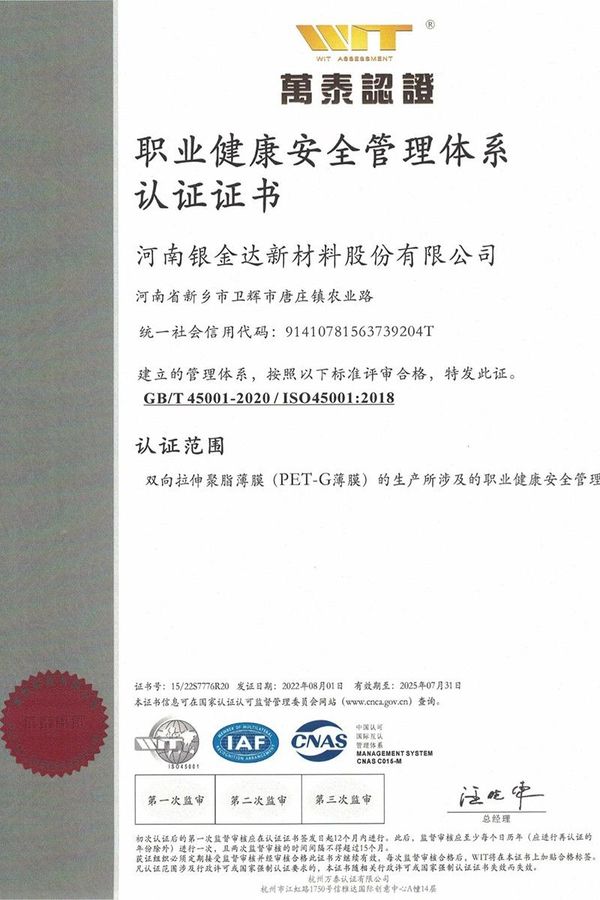 職業健康安全管理體系認證證書
