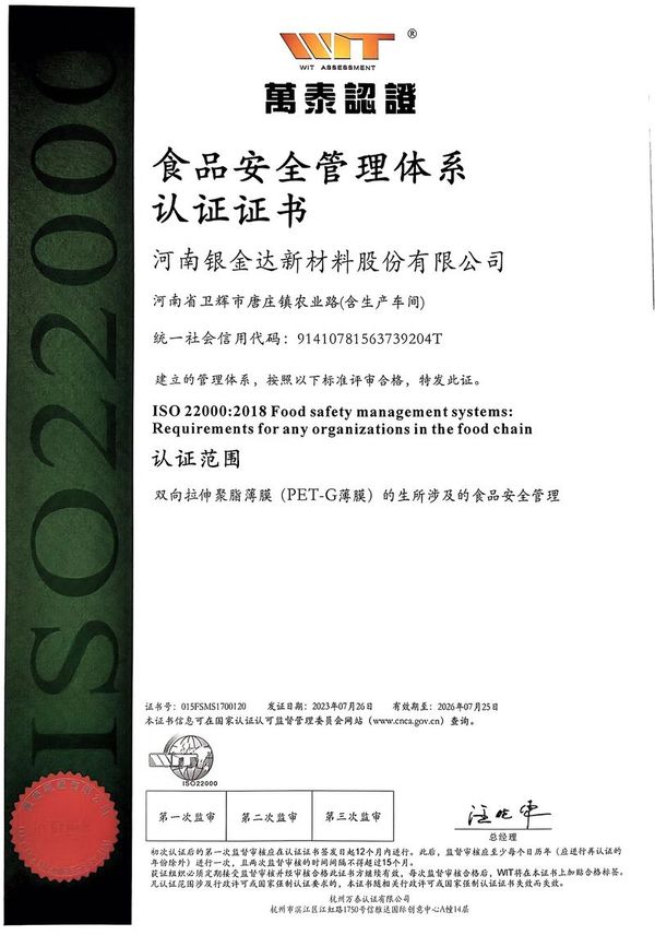 食品安全管理體系認證證書