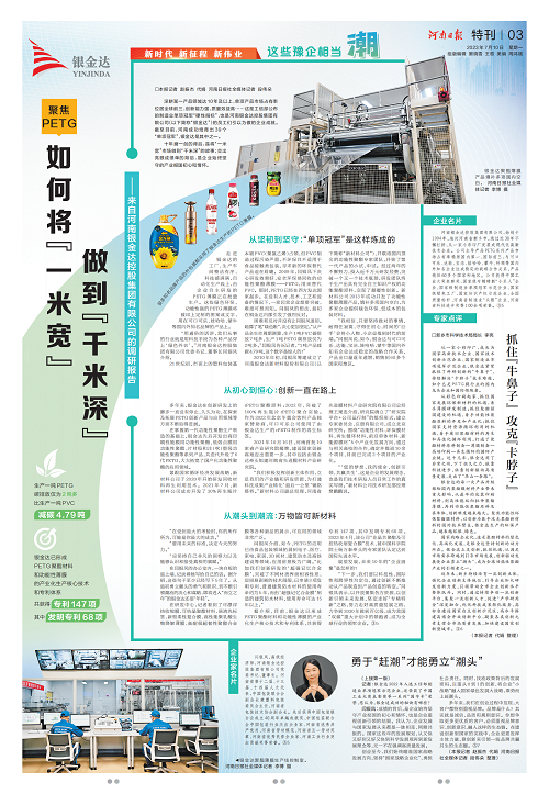 7月10日,《河南日?qǐng)?bào)》聯(lián)合《大河財(cái)立方》刊發(fā)銀金達(dá)董事長(zhǎng)閆銀鳳專(zhuān)題訪談《這些豫企相當(dāng)潮丨河南銀金達(dá)控股集團(tuán)有限公司:如何將“一米寬”做到“千米深”》,聚焦銀金達(dá)創(chuàng)新驅(qū)動(dòng)潮流涌動(dòng)的發(fā)展態(tài)勢(shì),新鄉(xiāng)市科學(xué)技術(shù)局李亮局長(zhǎng)對(duì)銀金達(dá)的創(chuàng)新驅(qū)動(dòng)高質(zhì)量發(fā)展之路給予高度評(píng)價(jià)。全文如下: