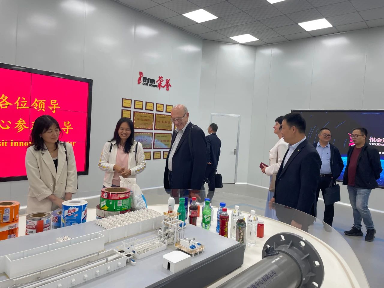 在達新源生產線夏總向彼得科維奇院士介紹了PETG產品的市場推廣應用情況,彼得科維奇院士對銀金達PETG產品取得的市場地位感到由衷贊嘆。